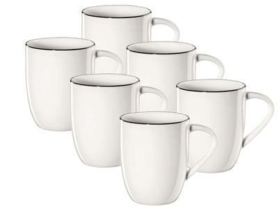 Jeder Henkelbecher ist aus erstklassigem Porzellan gefertigt, das für seine Robustheit und Langlebigkeit bekannt ist. Die makellos weiße Oberfläche der Becher wird durch einen feinen, schwarzen Linienrand akzentuiert, der den Bechern eine dezente, aber edle Note verleiht. Dieses zeitlose Design fügt sich harmonisch in jede Tischdekoration ein und verleiht ihr eine raffinierte Eleganz.