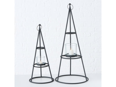 Das Windlicht aus pulverbeschichtetem Eisen hat eine Höhe von 58 cm. Liefermenge 1 Windlicht links im Bild, ohne Kerze.