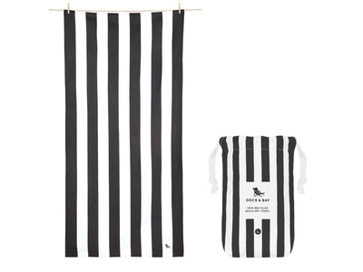 Das Dock & Bay Beach Towel in Kamari Charcoal vereint modernes Design mit höchstem Komfort. Das elegante Streifenmuster in schwarz macht dieses Strandtuch zu einem zeitlosen Begleiter – ob am Strand, Pool oder auf Reisen. Mit seiner großzügigen Größe von 160 x 90 cm bietet es ausreichend Platz zum Sonnenbaden, Relaxen oder Abtrocknen. Das hochwertige Mikrofaser-Material trocknet besonders schnell, ist angenehm weich und überzeugt durch hohe Saugkraft. Es lässt sich leicht und kompakt zusammenfalten und passt somit in jede Strand- oder Sporttasche. Gefertigt aus recyceltem Material ist dieses Handtuch nicht nur praktisch, sondern auch umweltbewusst.