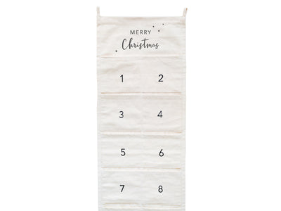 Der Adventskalender Merry Christmas von Eulenschnitt ist ein echter Blickfang für die Vorweihnachtszeit. Gefertigt aus hochwertigem, beigefarbenem Stoff, überzeugt er durch sein schlichtes, elegantes Design und den liebevoll eingestickten Schriftzug „Merry Christmas“. Die 24 aufgestickten Zahlen bieten Platz für kleine Geschenke, Kärtchen oder süße Überraschungen und machen das tägliche Öffnen zu einem besonderen Moment der Freude. Mit seinen großzügigen Maßen von 180 × 30 cm lässt sich der Kalender wunderbar an der Wand, an einer Tür oder entlang eines Treppengeländers dekorieren. Ein stilvoller und nachhaltiger Begleiter, der Jahr für Jahr für festliche Stimmung sorgt.