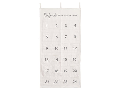 Der Adventskalender Vorfreude von Eulenschnitt ist ein ganz besonderes Stück, das Wärme und Besinnlichkeit in die Weihnachtszeit bringt. Gefertigt aus hochwertigem, beigefarbenem Stoff, begeistert er durch seine schlichte Eleganz und liebevolle Gestaltung. Der handgeschriebene Spruch „Vorfreude ist die schönste Freude“ verleiht dem Kalender eine persönliche, herzliche Note. Die Zahlen von 1 bis 24 sind aufwendig und hochwertig gestickt und machen jeden Tag im Dezember zu einem kleinen Highlight. Mit seinen großzügigen Maßen von 120 × 60 cm bietet der Adventskalender ausreichend Platz für kleine Geschenke, Botschaften oder Leckereien – ein stilvoller Begleiter, der Jahr für Jahr Freude schenkt.