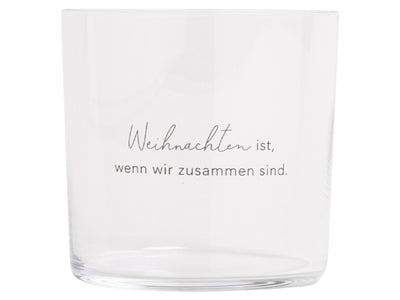 Das Trinkglas von Eulenschnitt mit dem liebevollen Zitat „Weihnachten ist, wenn wir zusammen sind“ bringt festliche Wärme auf jeden Tisch. Gefertigt aus klarem Glas und mit feiner weißer Schrift verziert, erinnert es auf charmante Weise an das, was in der Weihnachtszeit wirklich zählt. Mit einem Fassungsvermögen von 0,35 l eignet es sich perfekt für Wasser, Säfte oder winterliche Getränke – und lässt sich ebenso schön als Dessertglas für weihnachtliche Leckereien verwenden. Ein vielseitiges Glas, das Gemütlichkeit und Zusammenhalt stilvoll zum Ausdruck bringt.