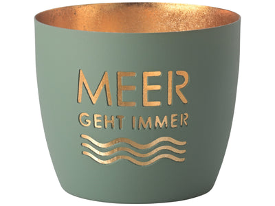 Bringen Sie das beruhigende Gefühl der Meeresbrise in Ihr Zuhause mit dem Windlicht „Meer geht immer“ von Giftcompany. Außen in sanftem powder blue gehalten und innen mit einer goldfarbenen Oberfläche versehen, sorgt es für ein warmes, stimmungsvolles Kerzenlicht. Der entspannte Schriftzug „Meer geht immer“ macht dieses Windlicht zum perfekten Begleiter für entspannte Stunden und maritime Dekoration.