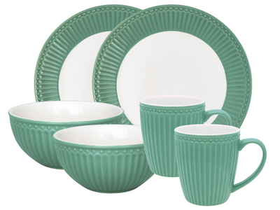 Das 6teilige Frühstücksset der Greengate Alice Serie in Dusty Green vereint natürliche Frische mit nordischer Zurückhaltung – ideal für zwei Personen. Der sanfte Grünton bringt Leichtigkeit auf den Tisch und lässt sich wunderbar mit anderen Farben der Serie kombinieren.