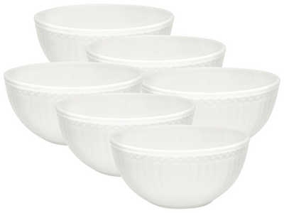 Das Set besteht aus sechs Müslischalen, die durch ihre dezente Rillenstruktur und die klassische weiße Farbgebung bestechen. Die schlichte Optik ermöglicht eine mühelose Kombination mit anderen Geschirrserien und fügt sich in jede Tischdekoration ein.