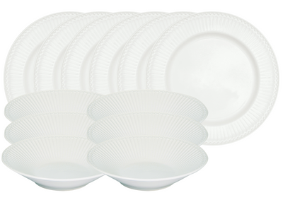 Das Greengate Alice Tafelset in strahlendem Weiß vereint skandinavische Schlichtheit mit robuster Alltagstauglichkeit und sorgt für eine stilvolle Tischgestaltung. Das 12-teilige Set ist ideal für sechs Personen und besteht aus sechs Speisetellern mit einem Durchmesser von 26,5 cm und sechs Pastatellern mit einem Durchmesser von 23 cm.