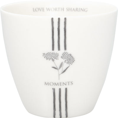 Der Latte Cup Sabine in Weiß mit dezentem Muster und der Aufschrift "Moments" und einem Fassungsvermögen von 0,35 Litern ist eine charmante Ergänzung für Kaffeegenuss. Die Kombination aus schlichtem Design und inspirierender Botschaft schafft besondere Momente bei jedem Schluck.