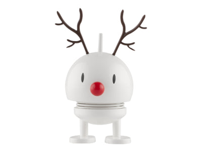 Der Hoptimist Reindeer Bumble S in der Farbe Weiß ist eine festliche Variante der beliebten dänischen Designfigur. Mit seinem fröhlichen Gesichtsausdruck, dem runden Körper und dem charakteristischen federnden Kopf verbreitet er sofort gute Laune. Die Figur ist etwa 9,5 cm hoch und besteht aus einer Kombination aus ABS-Kunststoff und Stahl.