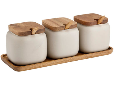 Die Aufbewahrungsdosen aus Porzellan haben eine Füllmenge von 350 ml und sind Spülmaschinengeeignet. Die Maße für das Tablett sind 11 x 29 x 2 cm und die Dosen haben jeweils 9 x 9 x 8 cm.