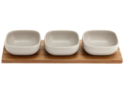 Die grauen Schälchen mit dem Untersetzer aus Akazienholz haben eine matte Glasur und eignen sich prima für Fingerfood, Antipasti, Dips und Saucen.