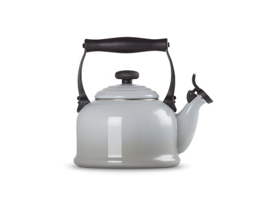 Der Wasserkessel Tradition von Le Creuset in der Farbe Perlgrau verbindet klassisches Design mit moderner Funktionalität.