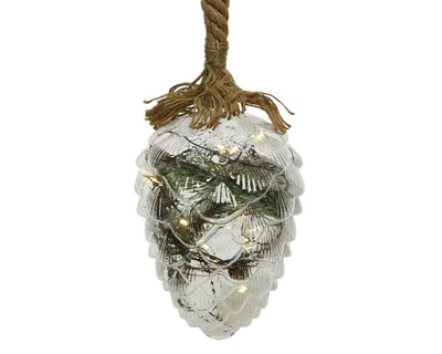 Der Micro LED Zapfen aus Glas mit Seil hat 15 Lampen, die mit einem warmen weißen Licht leuchten. Der Zapfen ist nur für den Innenbereich geeignet und benötigt 3 AA-Batterien, die nicht im Lieferumfang enthalten sind. Das Seil hat eine Länge von ca. 80 cm. Inklusive 6 Stunden Timer.