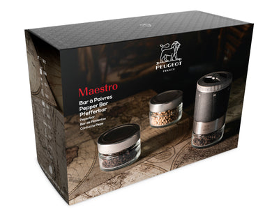 Das Peugeot Maestro Pfefferbar-Set wird in einer eleganten Geschenkbox geliefert und eignet sich perfekt als stilvolles Präsent für Gourmets, Hobbyköche oder Liebhaber edler Küchenaccessoires.