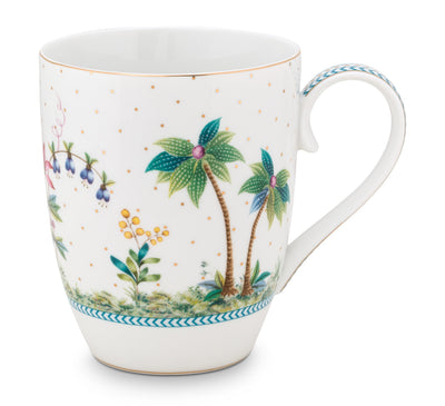 Mit der Jolie Kollektion entführt PIP STUDIO uns auf eine Reise auf eine einsame Insel. Einzigartige tropische Blumen und Pflanzen, bunte Früchte und Palmen machen diese Insel zu einem traumhaft schönen Ort. Für ein festliches Urlaubsfeeling werden auf den Geschirrteilen ein seltener weißer Reiher und exotische Pflanzenarten mit Blumen und goldenen Punkten kombiniert.