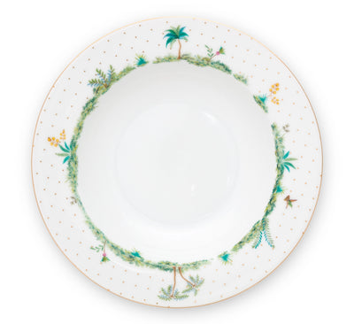 Mit der Jolie Kollektion entführt PIP STUDIO uns auf eine Reise auf eine einsame Insel. Einzigartige tropische Blumen und Pflanzen, bunte Früchte und Palmen machen diese Insel zu einem traumhaft schönen Ort. Für ein festliches Urlaubsfeeling werden auf den Geschirrteilen ein seltener weißer Reiher und exotische Pflanzenarten mit Blumen und goldenen Punkten kombiniert.
