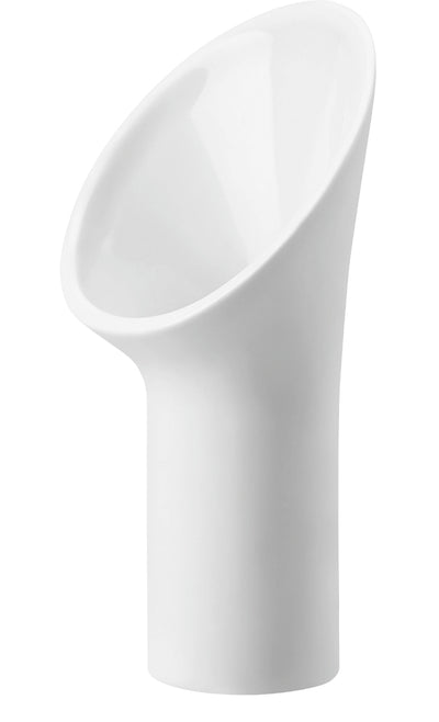 Die innen beschichteten, glänzenden Vasen mit dem einseitig hohen Kragen kommen in schlichtem Weiß, Schwarz, glänzendem Gold oder Platin daher und erwecken durch den zarten Gittereinsatz den Eindruck, als würden die Blumen darin schweben.