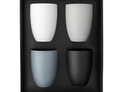 Das Becherset "the mug+" von Rosenthal umfasst vier doppelwandige Becher mit je 0,3 Litern Fassungsvermögen in den Farben Delicate Black Comfort Blue, Silky White und Gentle Grey. Die clevere Kombination aus modernem Design und isolierenden Eigenschaften macht sie ideal für heiße und kalte Getränke. Hochwertiges Material und Funktionalität vereinen sich in diesem stilvollen Set.