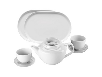 Inspiriert von seinen Reisen nach China hat Sebastian Herkner ein klassisches Set aus Teekanne, Schälchen, Tellern sowie Milch- und Zuckerkännchen entworfen. Seinem Stil, traditionelle Materialien mit einer klaren Formensprache und hohen Funktionalität zu verbinden, bleibt Herkner auch in der Zusammenarbeit mit Rosenthal treu. Die Formgebung interpretiert und kombiniert die Erfahrungen beider Teekulturen, seiner heimischen wie der chinesischen. Das Genießen des Tees und das Ruhen stehen im Vordergrund. Die klaren und runden Formen der Elemente greifen diese Aspekte auf und geben dem Tee die nötige Entfaltungsmöglichkeit. Tassen und Kanne bestechen durch klare Linien, einen feinen, durchscheinenden Scherben und schlichte Eleganz. Kannendeckel und Untersetzer sind aus Glas, ein Teesieb aus Stoff mit passender Ablageschale aus Porzellan ergänzt das Set.
