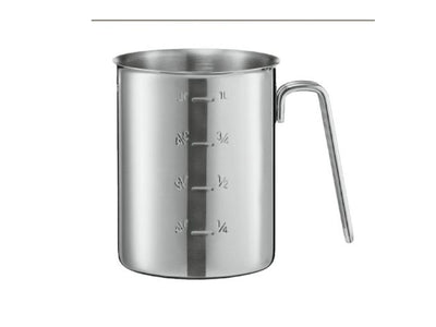 Verschiedene Größen, komplett aus Edelstahl 18/10 mit Drahtgriff, außen hochglanzpoliert, innen matt, Einteilung von außen und innen ablesbar, mit Schüttrand.