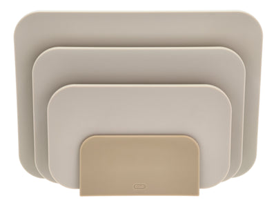 Dank der drei unterschiedlichen Größen eignet sich das Set für eine Vielzahl von Anwendungen – vom Schneiden von Obst und Gemüse bis hin zur Zubereitung von Fleisch oder Brot. Die griffige Struktur sorgt für sicheren Halt auf der Arbeitsfläche, während die flachen Formen eine einfache Handhabung und platzsparende Aufbewahrung ermöglichen.