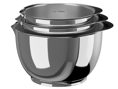 Das 3-teilige Rührschüssel-Set von Rosti aus Stahl ist die perfekte Grundausstattung für jede Küche. Es umfasst drei unterschiedlich große Schüsseln, die sich ideal zum Rühren, Mixen, Vorbereiten und Servieren eignen. Der hochwertige, rostfreie Edelstahl sorgt für Langlebigkeit und eine besonders hygienische Oberfläche, die weder Gerüche noch Geschmäcker annimmt. Jede Schüssel ist mit einem praktischen Ausgießer und einem stabilen Griff ausgestattet, was die Handhabung besonders komfortabel macht. Dank des gummierten Bodenrings stehen die Schüsseln sicher auf der Arbeitsfläche und verrutschen nicht beim Arbeiten. Die pflegeleichten Schüsseln sind spülmaschinengeeignet und lassen sich platzsparend ineinander stapeln – ein vielseitiges Set für den täglichen Einsatz.