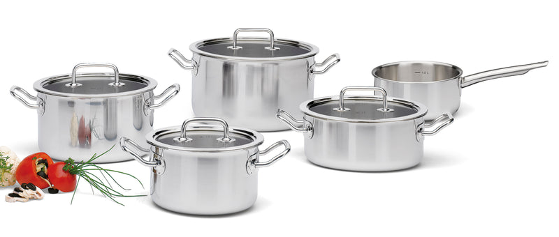 Das Spring BRIGADE BASIC Topfset 5teilig mit Glasdeckel ist eine vielseitige und zuverlässige Wahl für Ihre Küche. Das Set besteht aus hochwertigen Edelstahltöpfen mit passenden Glasdeckeln, die das Kochen überwachen und den Geschmack bewahren. Mit verschiedenen Größen ist es perfekt für unterschiedliche Kochbedürfnisse geeignet. Optimale Wärmeverteilung, wärmeisolierende Griffkonstruktion, mit praktischer Innenskala, geschlossener Topf- und Schüttrand.