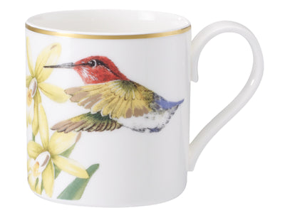 Dabei steht die moderne, eckige Form des Porzellans, die der aus der Serie Modern Grace entspricht, in einem reizvollen Widerspruch zur Verspieltheit der farbenfrohen Regenwaldmotive.