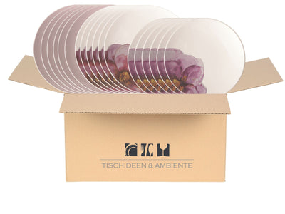 Die zarten Rosentöne und das feine florale Dekor schaffen eine einladende Atmosphäre und machen jede Tafel zu einem harmonischen Blickfang. Das Set besteht aus je sechs Frühstückstellern, Speisetellern rosa und Speisetellern weiss mit Blütenmuster – alles in der modernen Coup-Form mit weichen Rundungen.