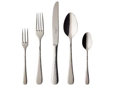 Zum Hingucker auf der gedeckten Tafel ist das Besteckset Leandra mit seiner schlichten Form und der charaktervollen Hammerschlag-Optik. Das 30-teilige Besteckset besteht aus je sechs Tafelmessern, Tafelgabeln, Tafellöffeln, Kaffeelöffeln und Kuchengabeln. Damit können Sie beim nächsten Dinner Ihre Gäste begeistern.