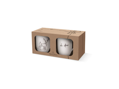 - Design: Schwarzes Rentier-Motiv auf einem Becher, Schriftzug "oh deer" auf dem anderen