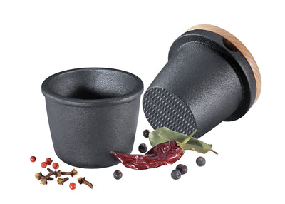 Das Gerät aus massivem Gusseisen mit dem beachtlichen Gewicht von 1 kg liegt gut in der Hand. Der Schaleninnenboden und der Mahlkonus sind geriffelt, so zerreiben Sie Pfeffer- und Salzkörner, Koriandersamen und auch ölhaltige Lebensmittel schnell und gleichmäßig.